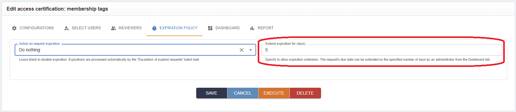 xdays from the Dashboard will result in an error.When enabled, users can specify the maximum number of days allowed for extension (in the example below it is 5 days).