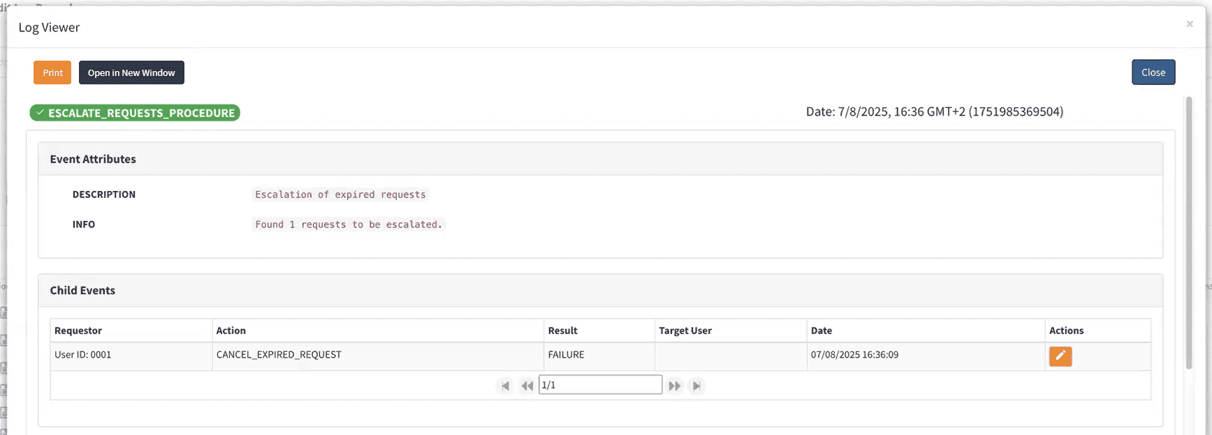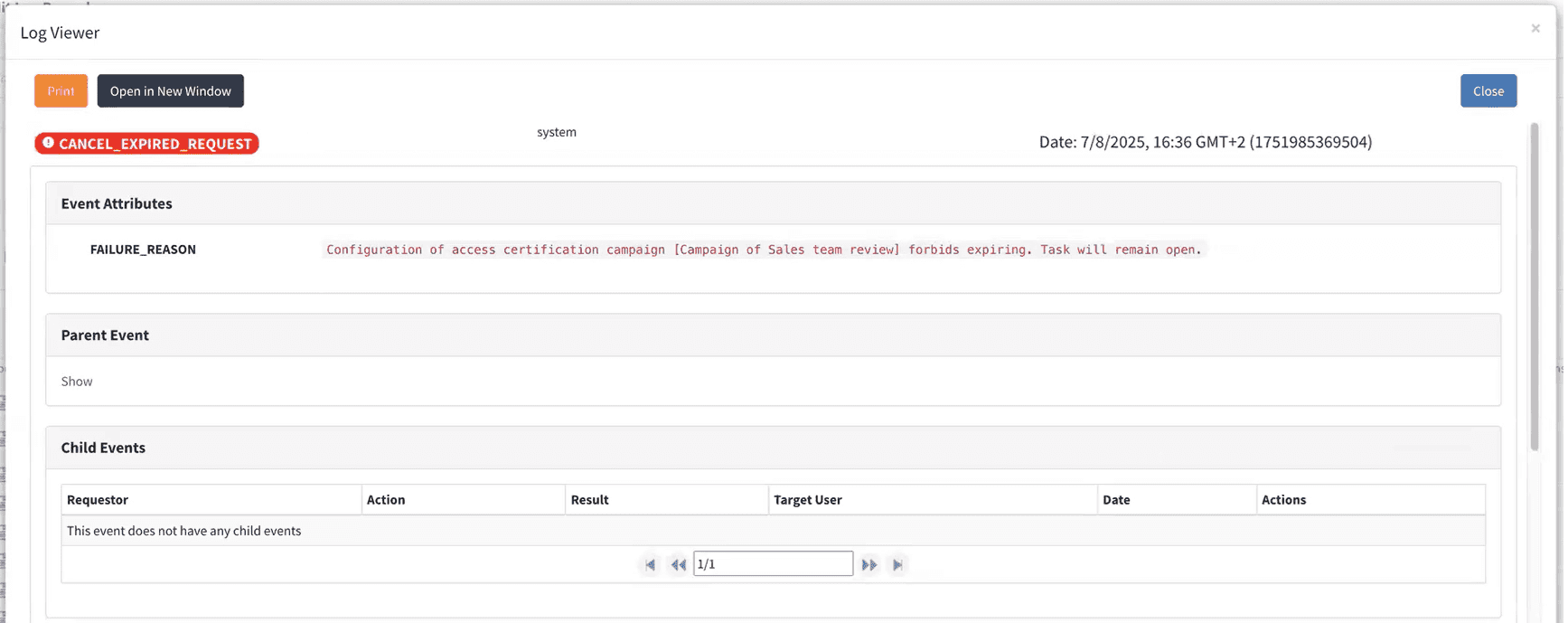 When run, the task processes access certification requests and applies expiration logic.By default, expiration is not allowed. In this case, the log entry for an expired request looks as follows: