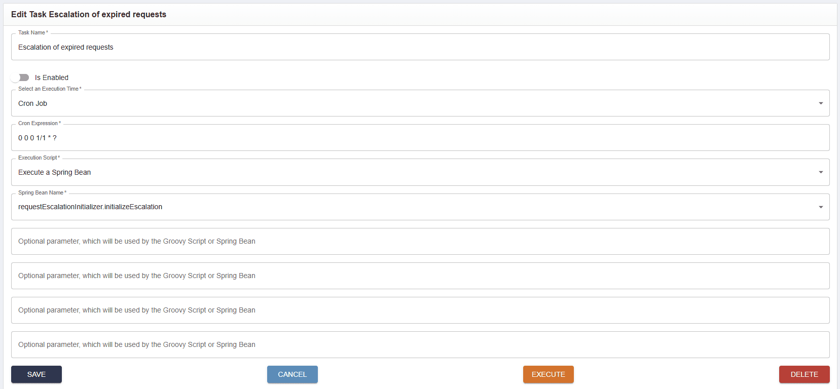 Find the batch task (Escalation of expired requests) and click the edit icon. You will be taken to the screen below.This is a default out-of-the-box batch task that is disabled, so move the slider to the enabled position.