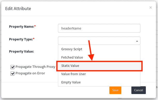 Property Namefield and selectProperty Type. For this example Property Type isStatic Value. But it possible to use different types, for example, User Name, Password or Groovy Script.