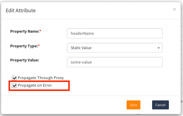Propagate on Error. If this value is unchecked, headers will be added to successful responses only. If checked, headers also will be added to responses with all HTTP statuses. For example, to responses with HTTP status of 404, 500 or any others.
