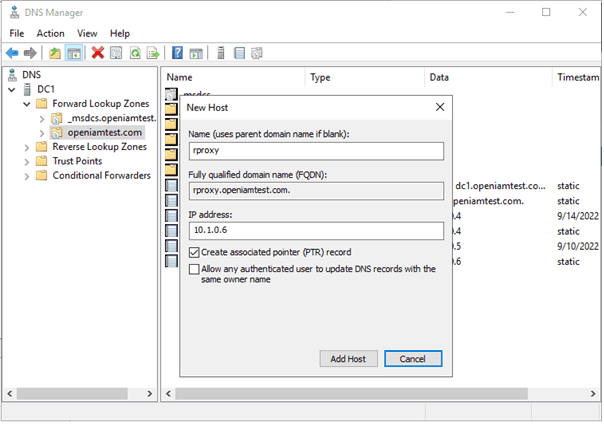 Next, open DNS Manager and expand Forward Lookup Zones folder and right click on openiamtest.com. Click on New Host (A or AAAA), enter details of rProxy host, check Create Associated Pointer (PTR) option and click Add Host.