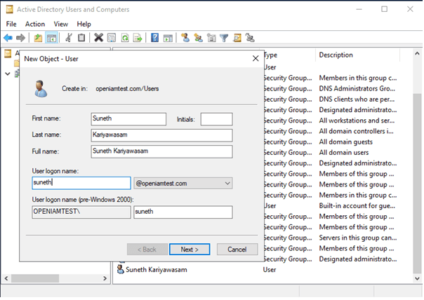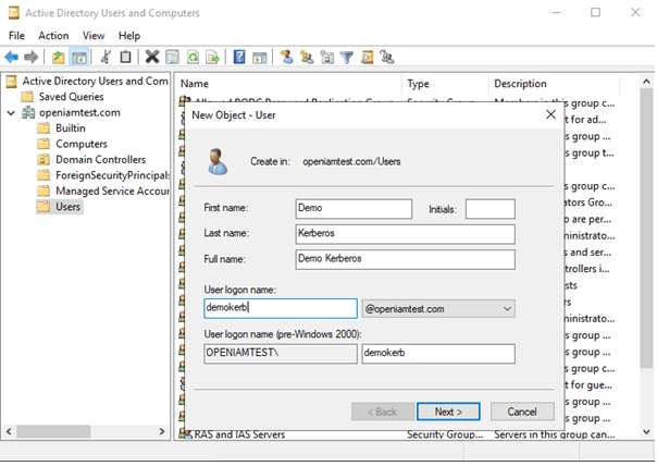 Go to Active Directory Users and Computers, click on Users and add two users as dummy Kerberose accounts for the rProxy hosts and an actual domain user to login to the client's Windows machine that performs SSO.