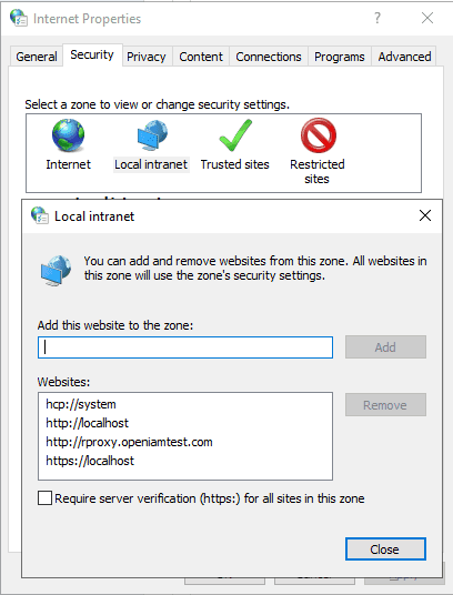 Go to internet options and click on security then local intranet then add http://rproxy.openiamtest.com