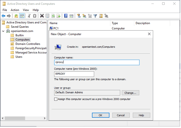 Go to Active Directory Users and Computers -> Right Click on Computers -> Click New. Then enter the details of the rProxy host as shown below and click OK.