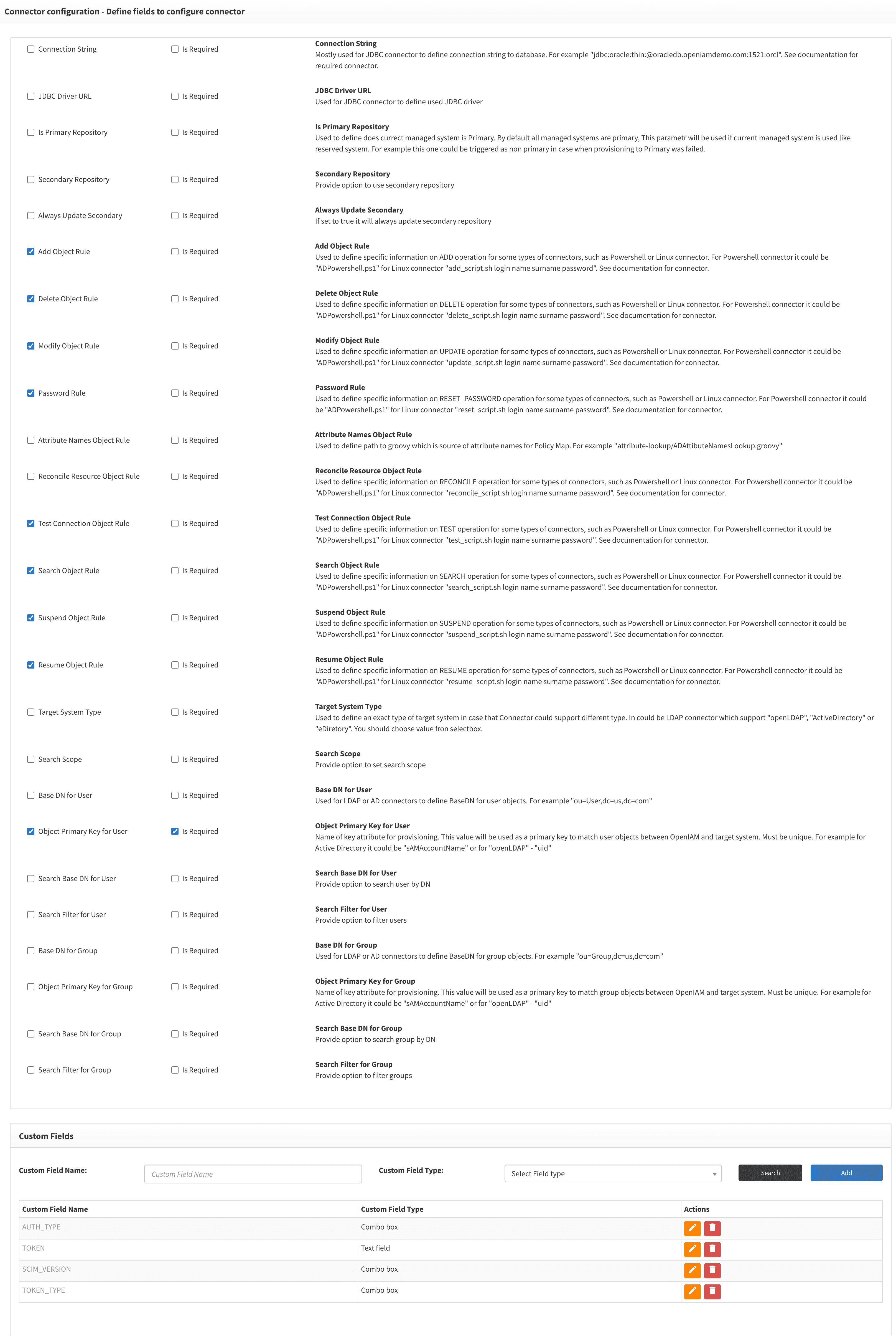 Since each connector is different, OpenIAM allows you to define the parameters which should be configured for the parameter. This applies to both connectors provided by OpenIAM as well as connectors that are developed by partners and customers.