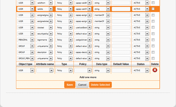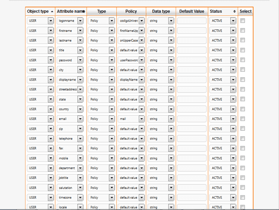 - Determine what attributes you need to pass to the SAP connector. Combined with the use of the Groovy scripting language, you can dynamically derive any attribute that is needed in SAP from the data maintained within OpenIAM. The screenshot below provides a sample mapping between rules in the Identity Manager, called attribute policies, and the SAP attributes. More details on the attribute policies and mappings can be found at the Policy map document.