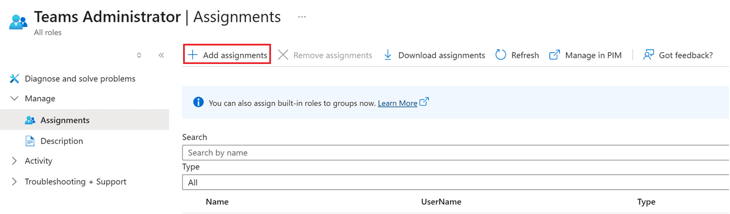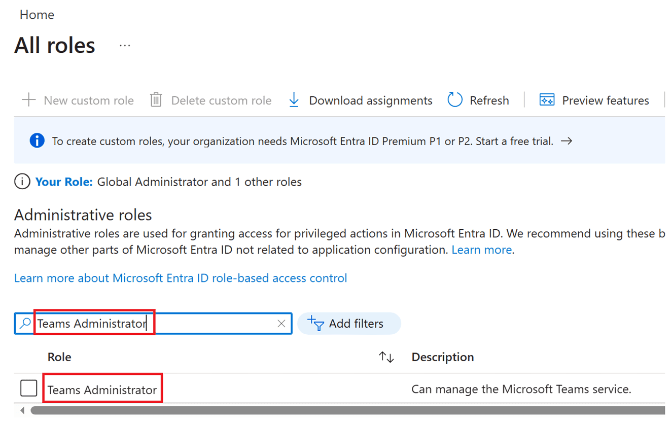 - In the search field, type Teams Administrator and select the Teams Administrator role.