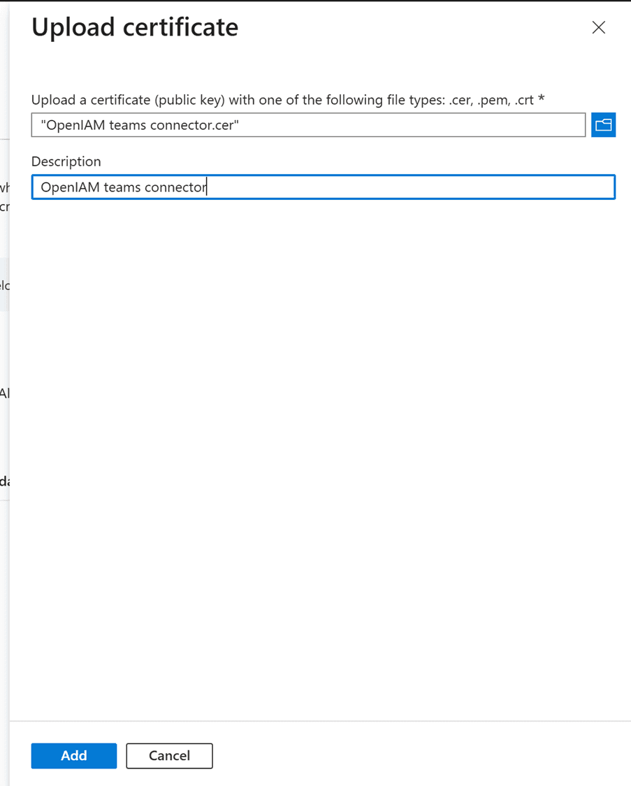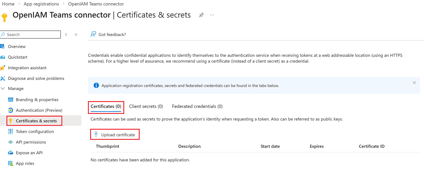 The Teams connector authorizes on the Entra ID (Azure) side using a certificate. This step requires two actions: