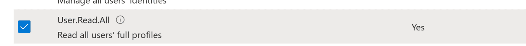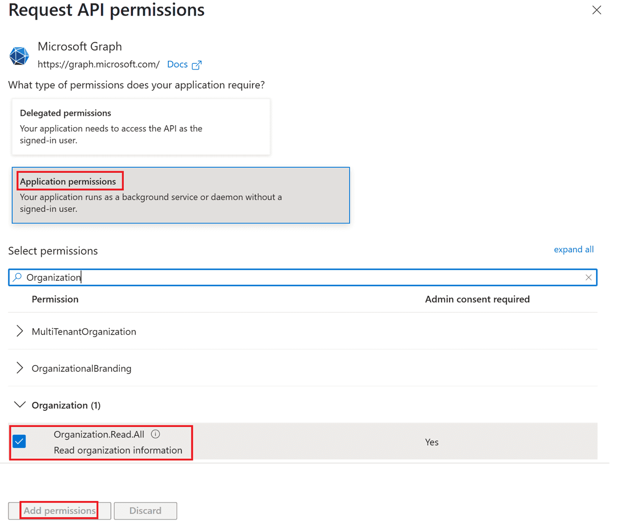 Organization.Read.AllandUser.Read.AllApplication permissions from the Microsoft Graph API, then click Grant admin consent.