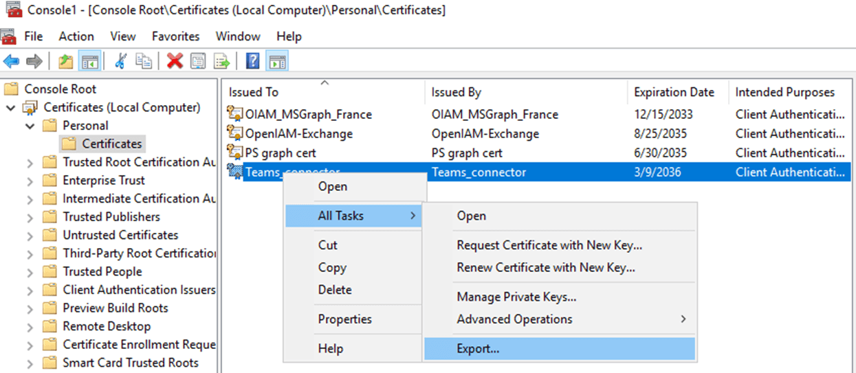 $certname = "Teams_connector"New-SelfSignedCertificate -Subject "CN=$certname" -CertStoreLocation "Cert:\LocalMachine\My" -KeyExportPolicy Exportable -KeySpec Signature -KeyLength 2048 -KeyAlgorithm RSA -HashAlgorithm SHA256 -NotAfter (Get-Date).AddYears(10)