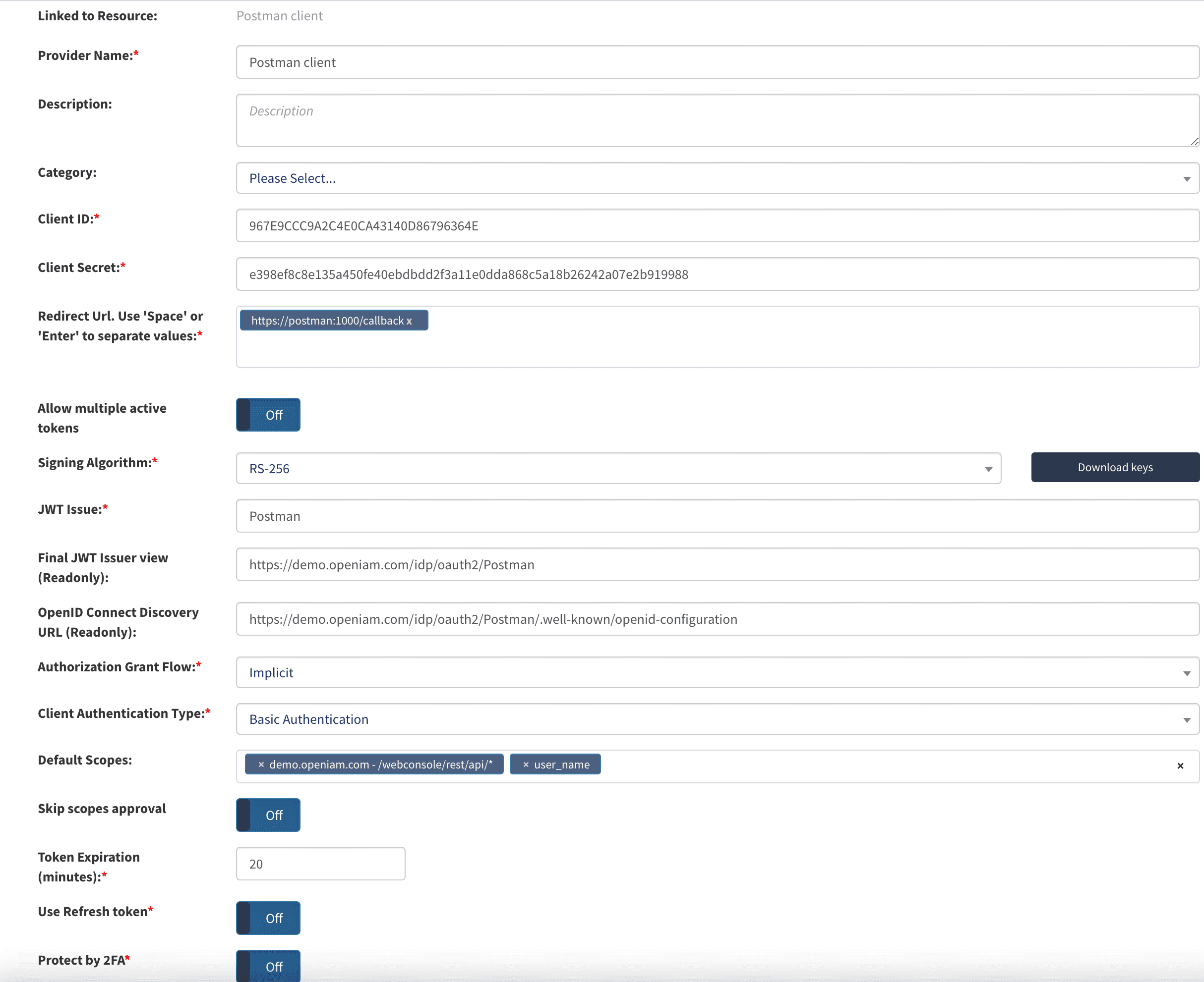 | Provider name | This can be any descriptive name to identify this configuration such as Postman client. |