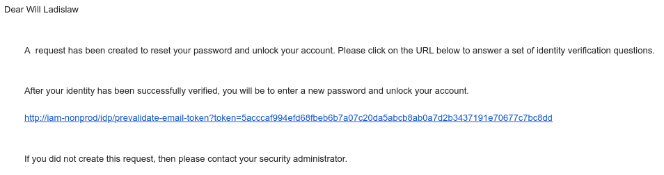 Check your e-mail inbox for an e-mail from the OpenIAM system entitled Unlock Account Request. The message will be like the one shown below.