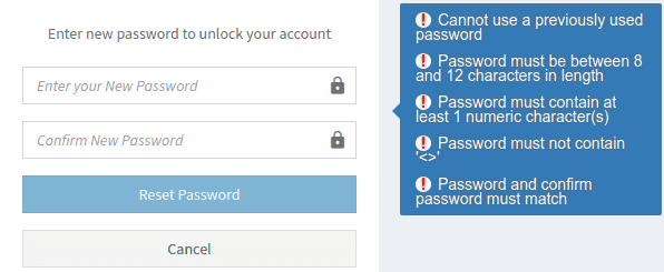 Enter a new password in the top textbox based on the criteria displayed to the right of the form (aka the password policy), and then enter it again in the textbox below to confirm. Click Reset Password. You will be taken back to the login screen where you can log in with your new password.