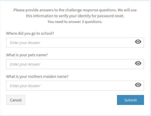 - Challenge response questions: these are a series of answers that were set by the user upon logging in for the first time. With this option chosen, the end user must answer these questions correctly to verify their identity to reset their password.