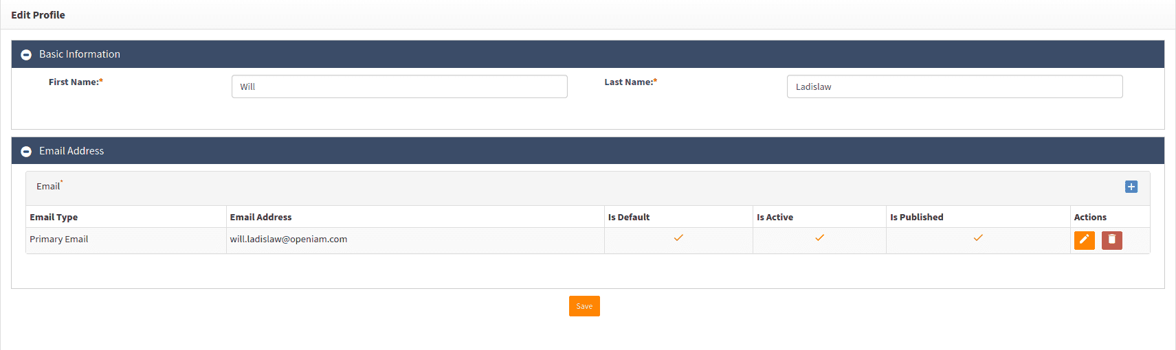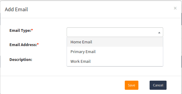 Choose Email Type from the dropdown menu. Primary Email marks the e-mail address as the one you wish to be contacted on. Fill in the Email Address and Description text boxes below, and then click Save.
