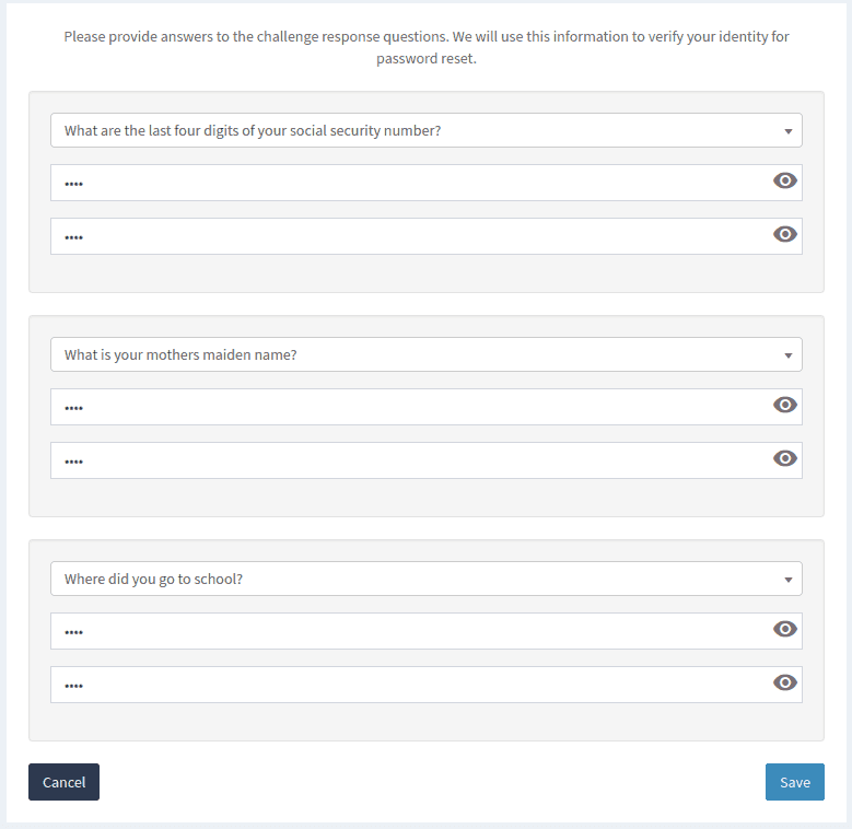 In the event an end user wishes to change or reset their password, challenge response questions can be used to verify their identity. Users, once logged in to the SelfService portal, have the option to update their answers to these questions, or choose different questions to answer entirely.