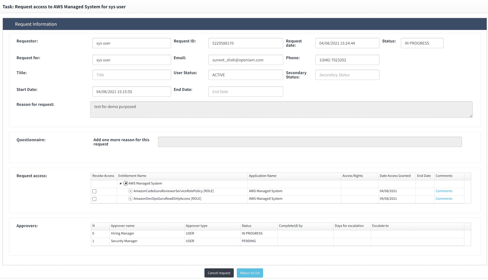 - A user access request is submitted for approval.