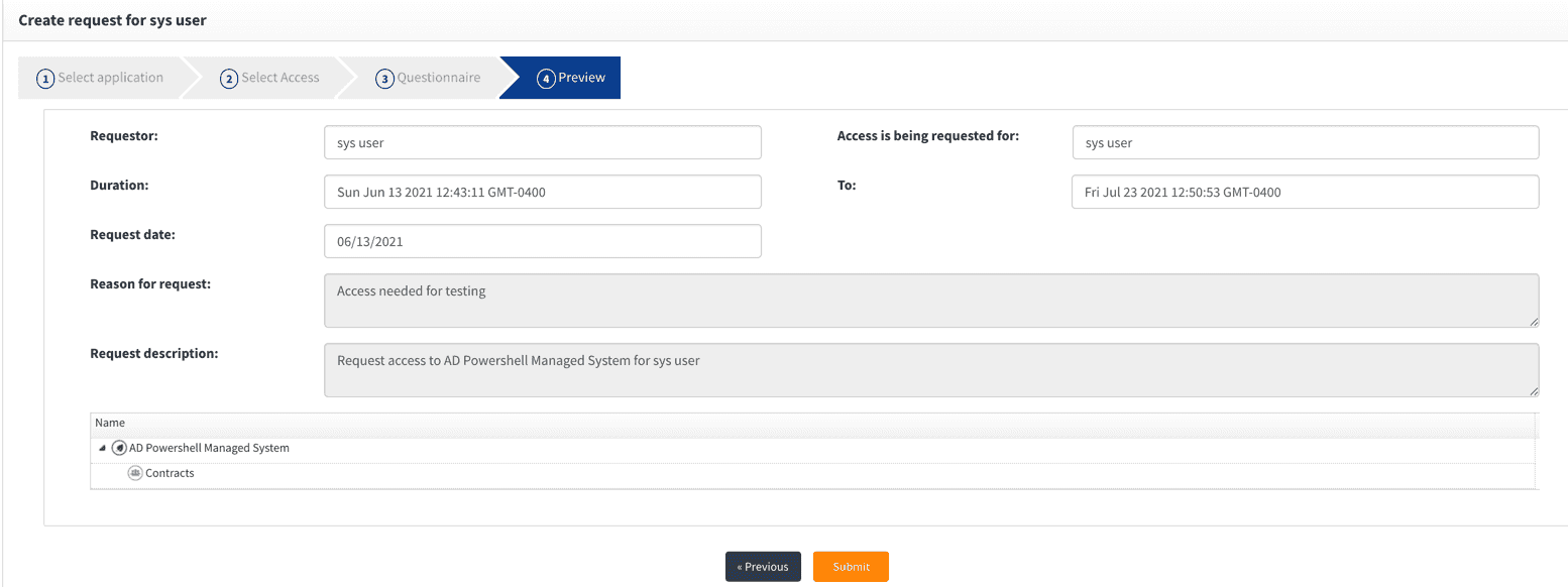 If the request contains all the required entitlements, click the Submit button. This will invoke the workflow, and the reviewer will be notified of the pending request.