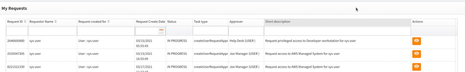 - Click the Actions button next to the request to view the request details. The example below shows the details of an existing request. You can see the list of approvers, and which one has approved/declined the request and when.