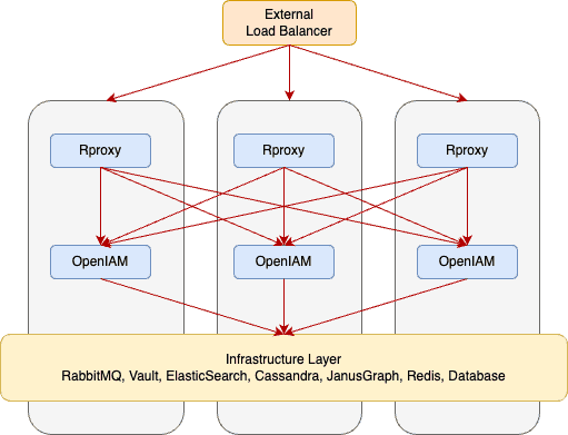 The hardware load balancer leverages algorithms to distribute requests to the nodes of the cluster to maintain performance and redistributes traffic in the event of a node failure. A particularly common algorithm is round robin which simply forwards requests to the next available server in turn. In the three-node cluster example above, requests are directed to an external load balancer which then routes traffic to the appropriate OpenIAM node based on current server resource utilization.
