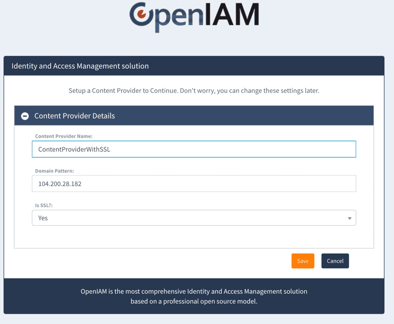 If this is this the first time that you are logging using SSL, then the system will ask you the set another content provider. Configure it as you did during the installation process, except ensure that the Is SSL? is set to Yes as shown in the image below.