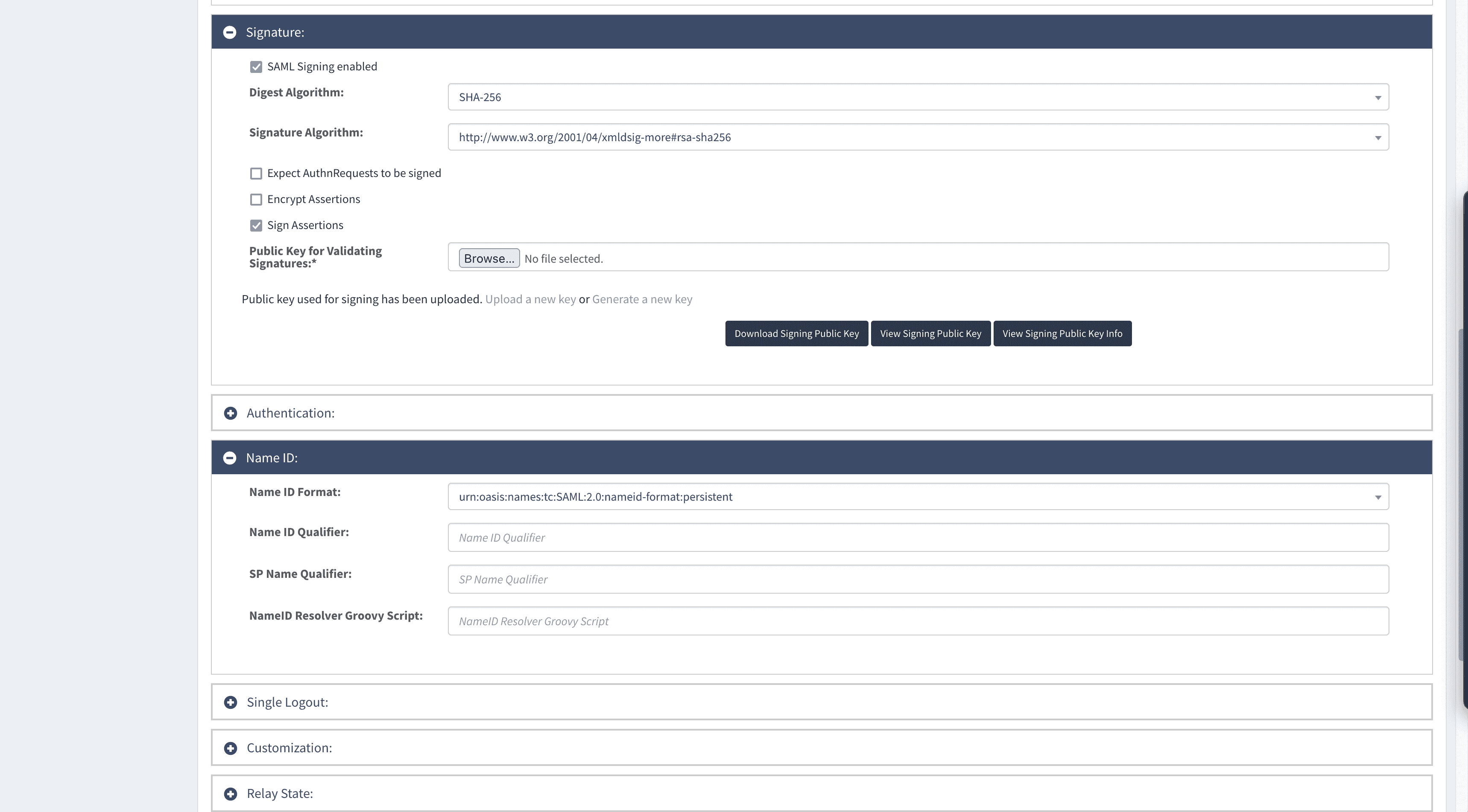 | SAML Signing enabled | Enable this checkbox as its signs your requests. |